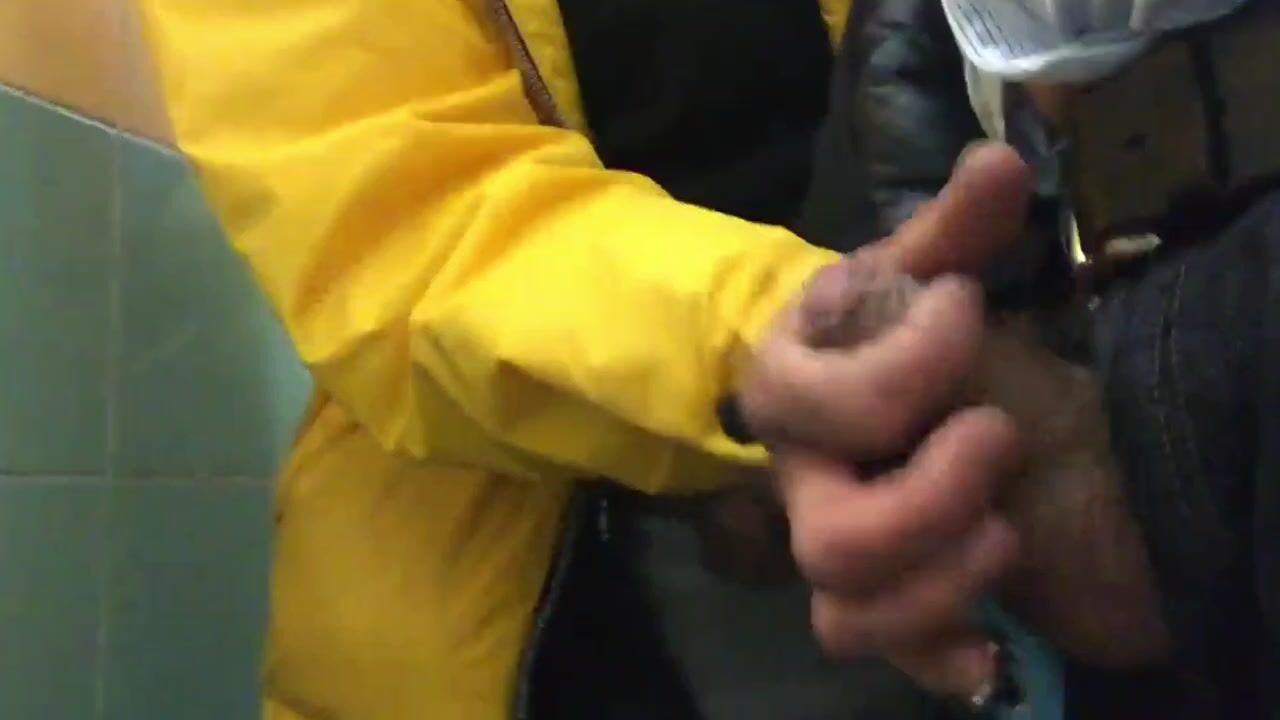 A European gay guy who has a tiny cock, and he takes out his small dick to jerk his dick in the toilet where his friend sneaks into the toilet, then he also takes his dick out and then grabs his friend's dick while he gets an erection. He sucks and blows his cock after hot masturbation. Both of them cums out.