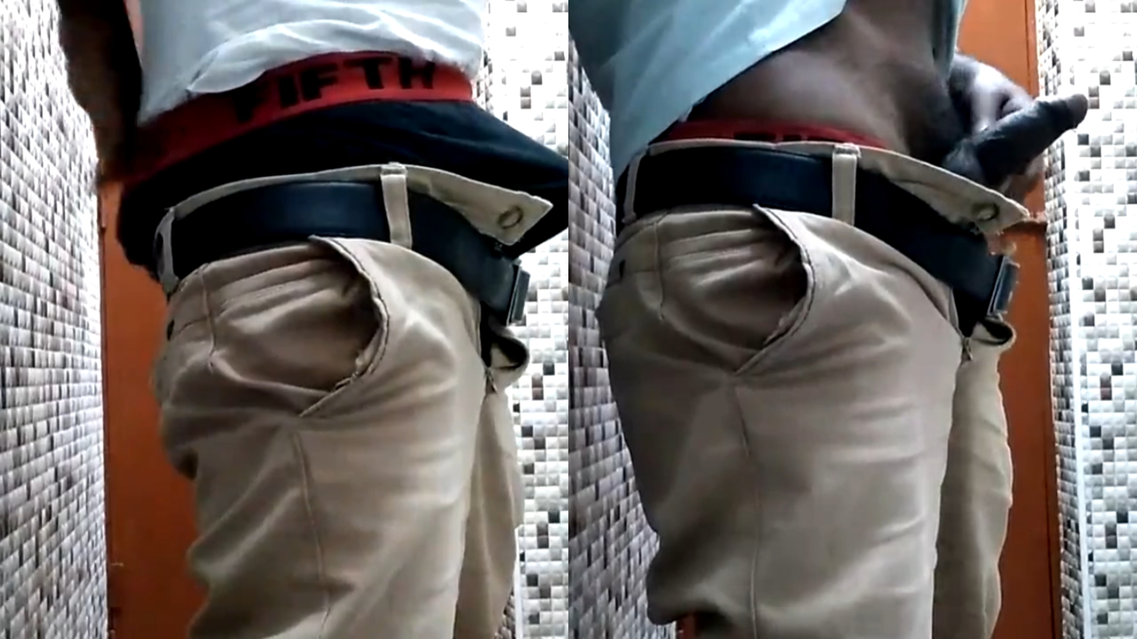 An Indian married tamil guy has a black cock, and he is a secret gay where he mastubates his dick in the toilet by thinking of a gay porn video in his mind, and so he sneaks into the toilet where he unzips his pants and then takes out his big adulthood cock out, then jerks his black cock and cums out.